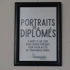 Nous avons transformé nos murs en une galerie vivante. Chaque portrait de diplômé exposé est accompagné d’un QR code. Un simple scan avec votre smartphone vous plonge directement dans leur témoignage audio.