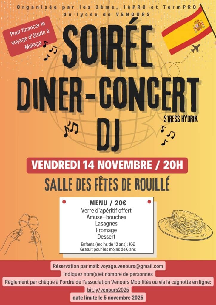 Les classes de 3ème, 1ère et Terminale du BAC PRO CGEA « Conduite et Gestion d’une Entreprise Agricole » du lycée de l’agricampus de Venours vous invitent à une soirée exceptionnelle : 📅 Vendredi 14 novembre🕗 À partir de 20h📍 Salle des fêtes de Rouillé Au programme :✨ Dîner convivial🎤 Concert live🎧 Ambiance DJ jusqu’au bout de […]